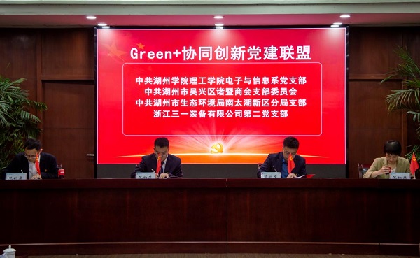 由电子与信息系支部牵头,联合中共湖州市吴兴区诸暨商会支部委员会、中共湖州市生态环保局南太湖新区分局支部、中共浙江三一装备有限公司第二支部组建了“Green+”协同创新联盟。