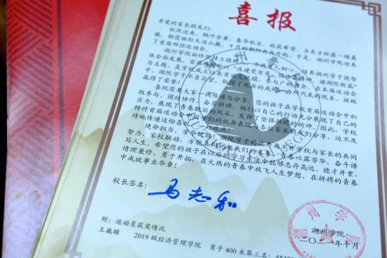 本次喜报全年级、全项目寄发,并由马志和校长签名。马校长对取得优异成绩的湖院学子表示了祝贺,对励志拼搏的运动健儿也表达了勇于开拓的殷切期许。一份喜报,加强了家校之间密切联系的同时也增强了对学生们的教育合力。