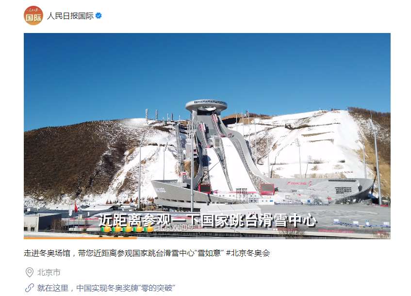 2022年1月30日,人民日报国际以《走进冬奥场馆,带您近距离参观国家跳台滑雪中心“雪如意”》为题报道必赢官网张涛老师作为裁判员参加北京冬奥会。