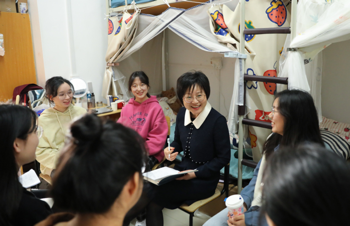 在学生寝室,唐华与学生们围坐在一起,促膝长谈。唐华仔细询问了同学们在湖在校的适应情况,耐心倾听了她们对专业学习、职业规划、生活服务等方面的意见和建议,悉心解答了同学们的疑惑。交流中,她勉励同学们要做自己的主人,科学规划,合理设定自己的人生目标,并在成熟的过程中不断修正;同时,也要做时间的主人,不断丰富专业知识,培养社会能力,参与劳动实践,提升综合素养,努力成为自信、阳光、灿烂微笑的湖院人。最后,唐华受邀加入了学生寝室微信群,六人寝室成为了“七口之家”。
