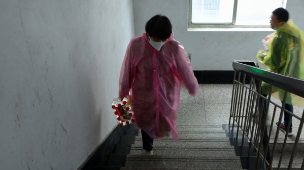 教师志愿者到达所负责学生公寓,待集散点位负责人领取相关物资后,教师志愿者分发物资至各学生寝室门口。
