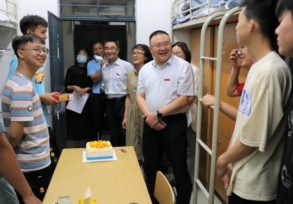 校领导班子走访慰问2021级新同学,为报到当天过生日的同学送上生日蛋糕和书籍,同过暖心生日,勉励他们做有志气、有骨气、有底气的新时代青年。