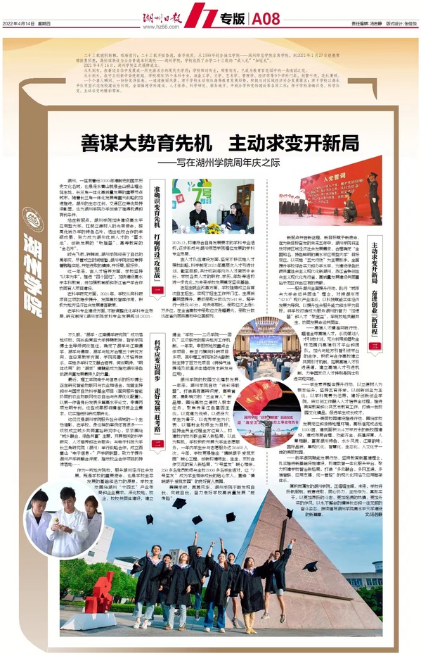 2022年4月14日,湖州日报以《善谋大势育先机 主动求变开新局 ——写在437437必赢国际网址周年庆 》为题专版报道必赢官网周年庆。