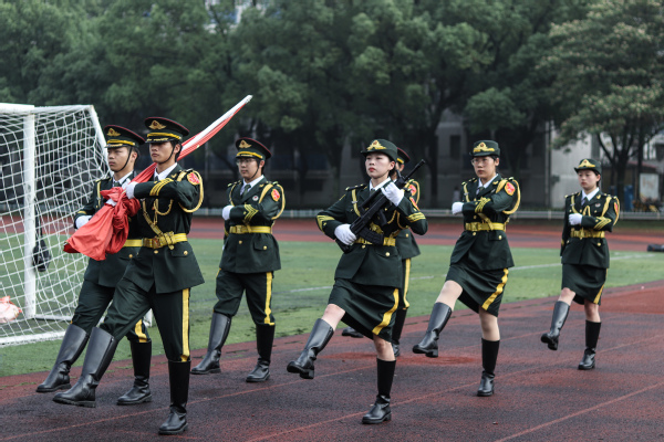 旭阳初微蕴含勃勃生机。国旗护卫队目光如炬,步伐坚定,护送国旗至升旗台。伴随着庄重昂扬的国歌,国旗冉冉升起。