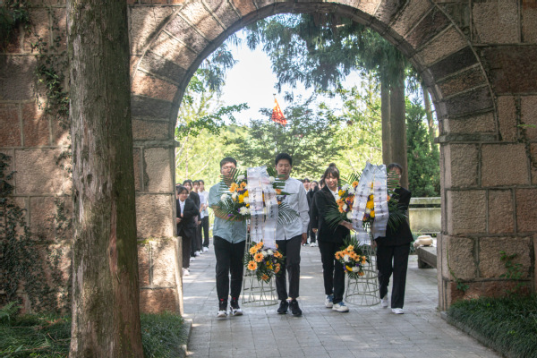 在郎部公墓,预备党员代表们向革命烈士敬献花篮,全体同志默哀致敬,纪念先烈英魂。