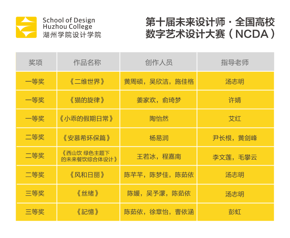 设计学院始终以服务地方经济,培养复合型应用人才为准则,此次国赛获奖成果充分展现了设计学院学生优秀的创新设计能力,也是复合型应用人才培养成果的集中体现;学院将以此次全国高校数字艺术设计大赛(NCDA)获奖成果为契机,鼓励学生积极参与各项国家级、省级专业学科竞赛,以赛促学、以赛促教、以赛促创。