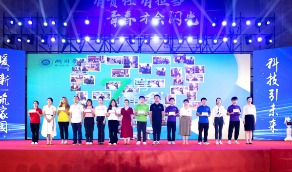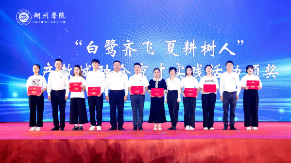 在“白鹭齐飞 夏耕树人”产教城融合育才实践活动颁奖仪式上,校领导为获奖师生颁奖。2022年的夏天,他们奔赴湖州的工厂、农村、社区实践锻炼,讲最红的故事,干最实在的事情。