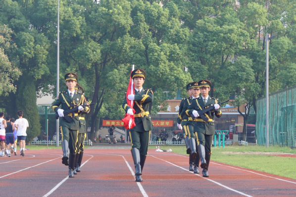 7点整,国旗护卫队出旗,嘹亮的国歌声在操场响起。全体师生行注目礼、庄严肃穆。升旗完毕后,学工办副主任宣布马克思主义学院学生会学生负责人名单、党建中心负责人名单,党总支书记将学生会会旗授予学生会负责人。