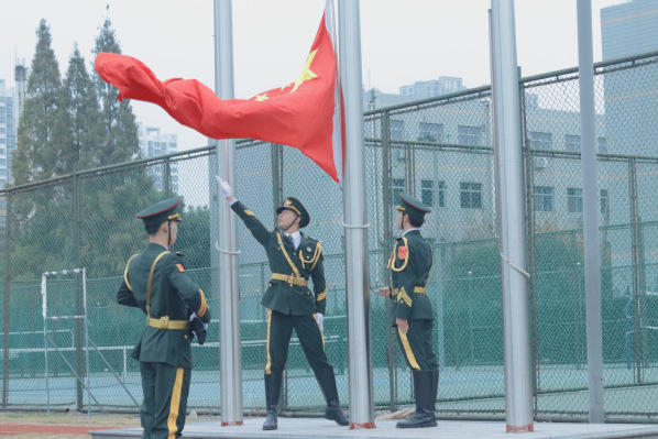 11月14日上午,马克思主义学院在西校区光彩体育场举行“学习二十大,湖院青年说”升国旗仪式。7:10升旗仪式正式开始。国旗护卫队出旗,伴随着庄严的《义勇军进行曲》,全体师生注视着鲜艳的五星红旗冉冉升起。