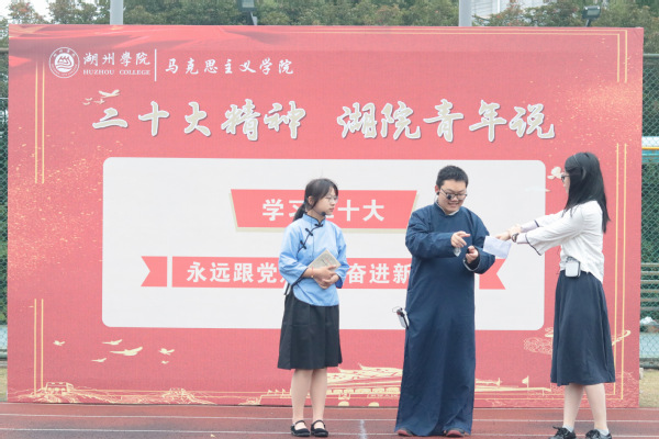 升旗完毕后,湖院青年说宣讲团成员以红色情景剧《红船初心》献礼党的二十大。宣讲团生动演绎了1921年的青年大学生得知中共一大顺利召开的喜悦和激动。站在新时代起点上,不忘初心的青年人,定将红船精神继承发扬;紧密前行的青年人,定将同心筑梦,奋发图强。