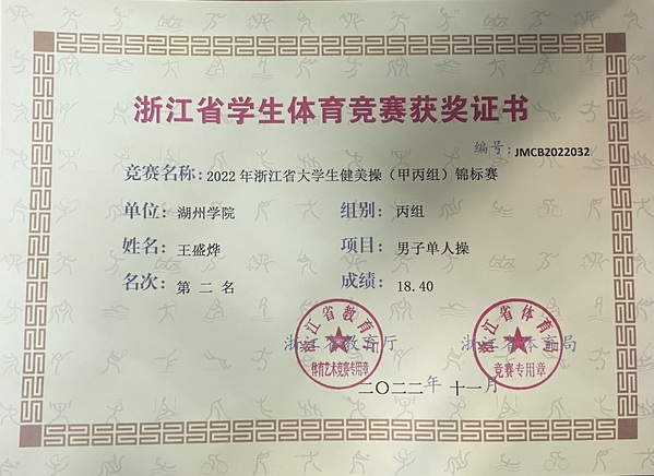 11月27日,由浙江省教育厅、浙江省体育局主办的2022年浙江省大学生健美操(甲丙组)锦标赛在浙江科技学院小和山校区落下帷幕,学校健美操队王盛烨荣获丙组男子单人操亚军。