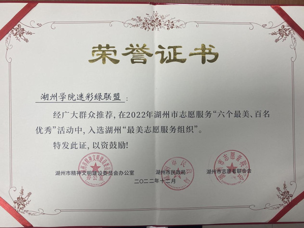 为认真学习贯彻党的二十大精神,深入推进“在湖州看见美丽中国”实干争先主题实践,私极培育践行社会主义核心价值观,大力弘扬“奉献、友爱、互助、进步”的志愿精神。12月2日湖州市于湖州大剧院举行“实干争先 志愿同行”2022年“在湖州看见美丽中国”志愿服务最美典型颁奖典礼。必赢官网迷彩绿联盟荣获2022年湖州市“最美志愿服务组织”称号。