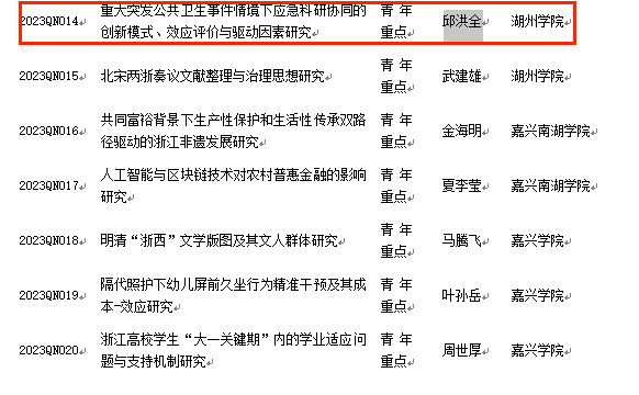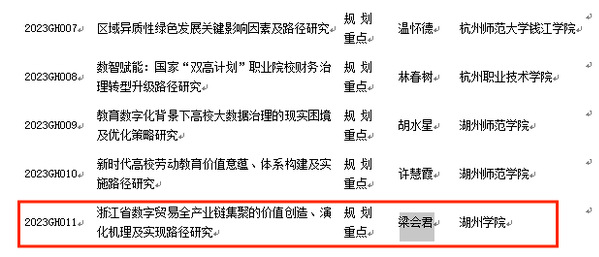 近日,浙江省教育厅办公室发布了《浙江省教育厅办公室关于公布2021—2022年度浙江省高校重大人文社科攻关计划项目的通知》(浙教办函〔2023〕26号),我院2项课题获批立项。分别是:梁会君老师主持的《浙江省数字贸易全产业链集聚的价值创造、演化机理及实现路径研究》入选规划重点项目、邱洪全老师主持的《重大突发公共卫生事件情境下应急科研协同的创新模式、效应评价与驱动因素研究》入选青年重点项目。