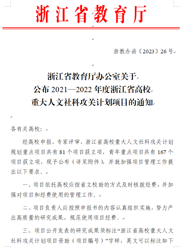2个项目喜获2021—2022年度浙江省高校重大人文社科攻关计划项目立项。