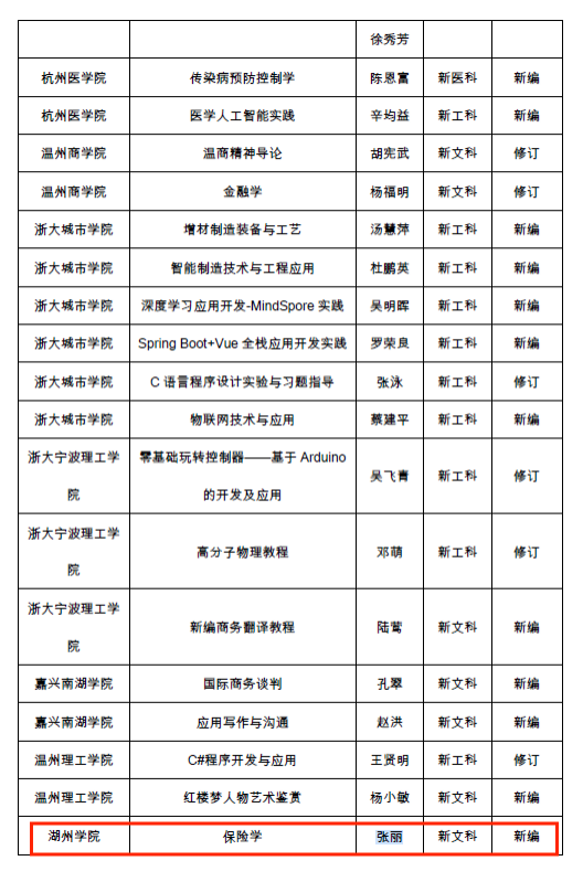 日前,浙江省高等教育学会公布了浙江省普通本科高校“十四五” 首批重点教材建设项目评选结果,我院张丽老师主编的《保险学》教材获得省普通本科高校“十四五”首批重点教材建设立项。此次入选的教材充分反映中国特色社会主义理论与实践新发展、浙江省新时代文化创新高地建设新成果、新文科建设新内容,是我院提高教学质量的重要成果之一。