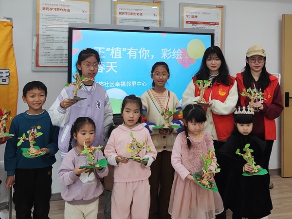 在简单科普完植树节的知识后,电子信息学院的志愿者们带领东柿社区的小朋友们做起了“一棵树”的手工,志愿者们耐心帮助小朋友,彼此合作完成从纸张到一棵树的过程,共同体验手工活动的乐趣。现场气氛热烈,志愿者们鼓励小朋友给自己做的树命名,为自己的树赋予更多的意义。活动结束后,参与植树节活动的小朋友与我院的学生们合影留念。