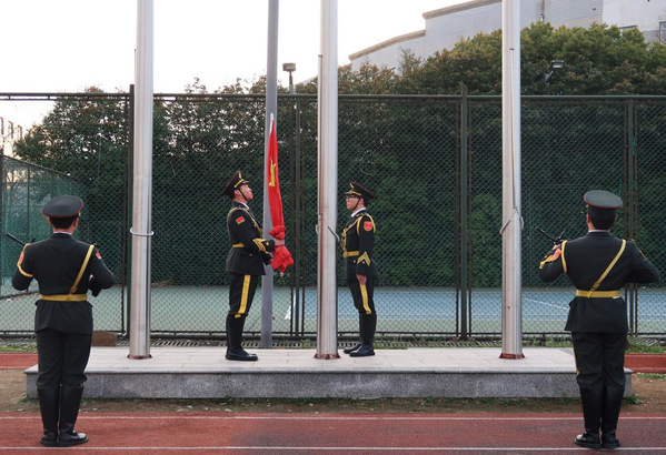 在全体师生的注目礼下,英姿飒爽的国旗护卫队队员们迎着朝阳护送鲜艳的五星红旗进场,行礼完毕,伴随着庄严的《中华人民共和国国歌》,五星红旗冉冉升起,迎风飘扬。在场的每一个人向国旗行注目礼,深怀对祖国无限的热爱和崇高的敬意。