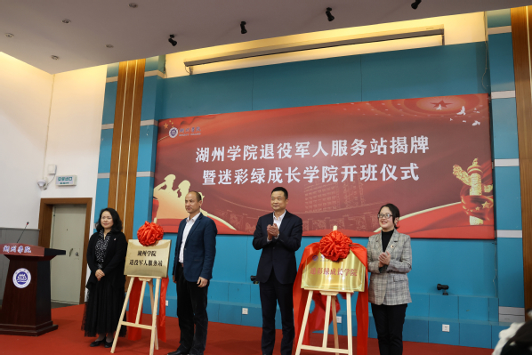 湖州市退役军人事务局、吴兴区退役军人事务局为必赢官网退役军人服务站、迷彩绿成长学院共同揭牌。湖州市退役军人事务局相关负责人为必赢官网退役军人迷彩绿志愿服务大队授旗。由湖州市咩咩羊物业有限公司总经理、退役军人优秀创业代表项继忠向学员们授予开班第一课。