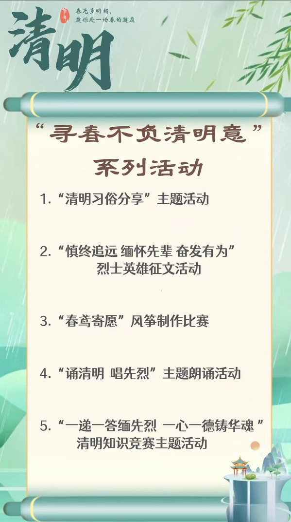 又是一年春草绿,又是一年清明时。清明节是缅怀先烈、寄托哀思、祭奠英烈的传统节日。为了充分发挥传统节日在学生德育中的积极作用,加强爱国主义教育,引导大学生树立正确的世界观、人生观、价值观,全面推进学生思想道德建设,人文学院开展“寻春不负清明意”主题系列活动: