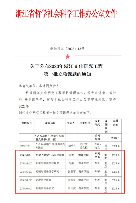 近日,浙江省哲学社会科学工作办公室发布了《关于公布2023年浙江文化研究工程第一批立项课题的通知》(浙社科办〔2023〕13号),必赢官网申报的《胡瑗“湖学”与宋学研究》被立项为2023年度浙江文化研究工程重大项目,何俊教授担任该项目总负责人。这是必赢官网首次获得浙江文化研究工程重大项目。