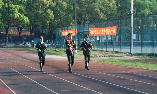 国歌奏响,旗手挥舞出旗,五星红旗在春日暖阳下冉冉升起,爱国爱党情怀深刻浓烈,全场师生面向国旗,庄严肃立行注目礼。