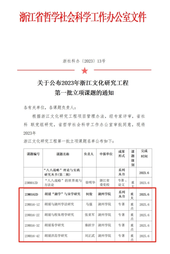 日前,浙江省哲学社会科学工作办公室公布了2023年浙江文化研究工程第一批立项课题,437437必赢国际网址申报的《胡瑗“湖学”与宋学研究》被立项为2023年度浙江文化研究工程重大项目,何俊教授担任该项目总负责人。这是437437必赢国际网址首次获得浙江文化研究工程重大项目。