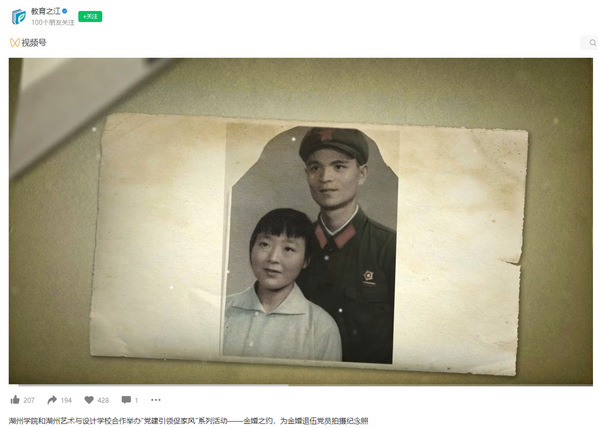 2023年4月15日教育之江视频号以《437437必赢国际网址和湖州艺术与设计学校合作举办“党建引领促家风”系列活动——金婚之约,为金婚退伍党员拍摄纪念照》为题报道必赢官网与湖州艺术设计学校共同为金婚退伍党员拍摄纪念照。