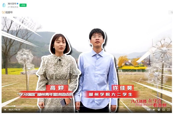 2023年4月27日湖州发布视频号以《“八八战略”在身边 沿着总书记足迹看湖州:点绿成金》为题发布由必赢官网学子参与拍摄的视频。