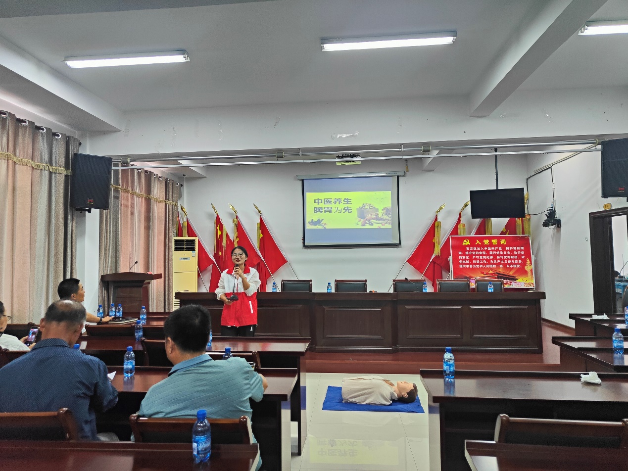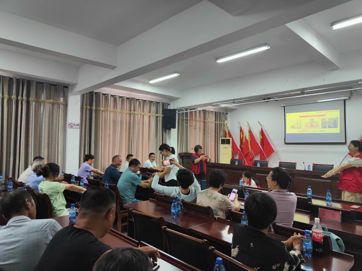 长兴和平东山村党总支书记张学军致辞,表达了对生命健康学院一行的欢迎,随后开展知识讲座。护理系王瑞老师进行了心肺复苏及相关急救知识培训,向东山村村民讲解了心脏骤停的概念、特征、及倒地患者是否需要实施急救的快速判断方法,并借助教学假人演示了心肺复苏(胸外按压)的具体流程,包括判断呼吸、摆正体位、胸外按压、打开气道、口对口呼吸、按压与吹气之比、观察循环、呼吸情况等。护理系夏洪晨老师,以“中医养生 脾胃为先”为主题,介绍了夏日“10字养生法”,即护心、少怒、吃苦、多走、补钾,让中医药进农村文化礼堂,让村民感受中医在预防、保健、养生等方面的独特魅力。