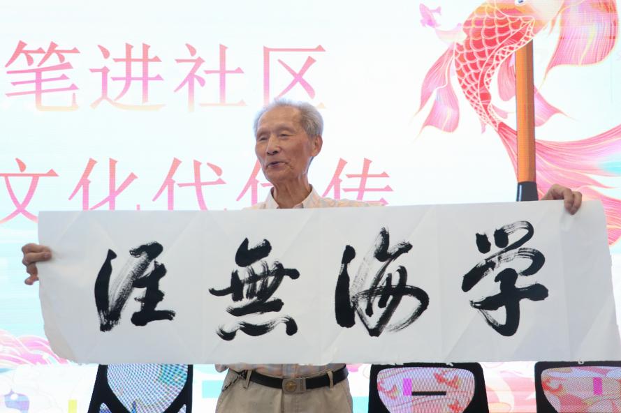 湖州市书法家徐济文老师从文字的诞生讲起,结合自身75年练习书法的心得体会,以现实作品为例展示书法魅力,传授书法技巧。最后徐老师写下“学海无涯”四字,既是精彩的示范,亦是恳切的劝勉。
