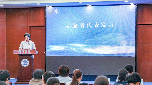 会上,志愿者代表发言,表达了全体志愿者将努力践行新时代的志愿精神,为参赛队伍提供优质的志愿服务,展现湖院青年的志愿风采的决心。