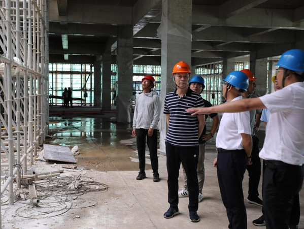 马志和一行实地走访了新校区一标段和二标段建设现场,听取了代建单位房总集团关于现场施工进度、施工工艺和安全生产措施的介绍。在新校区两个标段现场,马志和为高温期间仍坚持奋战在施工一线的工程建设者送去关怀,对他们为新校区建设所付出的辛勤劳动表示敬意和感谢。随后参观了一标段项目现场智慧工程展厅,体验智慧工地、安全生产相关内容,并对相关工作提出了指导意见。