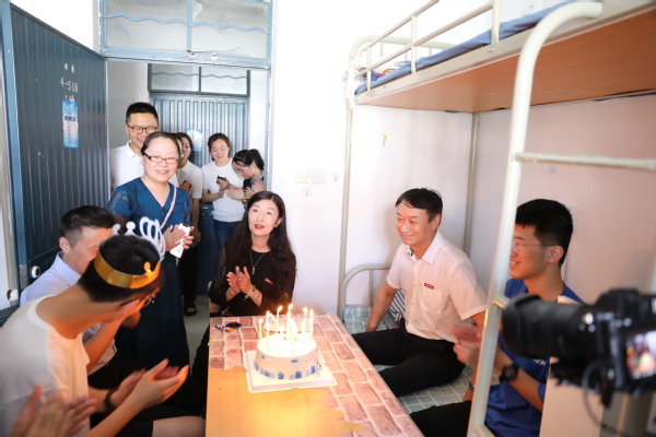 校领导为报到当天过生日的同学送上生日蛋糕,作为同学们的7号室友他们还送上开学礼物和书籍,勉励他们用信念与坚持面对生活、学习中的每一个困难,用理想信念把住人生之舵,脚踏实地以至千里。