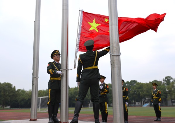 动员大会在庄严的升旗仪式与奏唱国歌中开始。全体师生整齐划一,庄严肃穆,向国旗行注目礼。