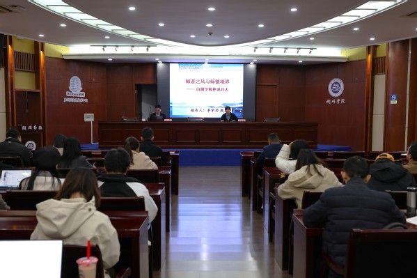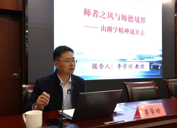 李学功以“湖学”为切入点,结合自身经历,通过鲜活的案例、生动的语言、严密的逻辑,系统阐明了湖学文化的精彩纷呈、博大精深,深刻阐释了“师者之风”的丰富内涵。谈及树立 “师道”境界,李教授以孔颜乐处为例,引出了在艰难条件下,为了追求理想而达到的乐观主义境界,同时也对胡瑗提倡的境界“视诸生如其子弟,诸生亦信爱如其父兄,从之游者常数百人”进行了解读。李教授深入剖析了当前社会转型时期师德师风问题产生的主要原因,并从如何继承与弘扬中国优秀传统,践行“四有”好老师,做好“经师”和“人师”的统一者等方面提出对策和建议。