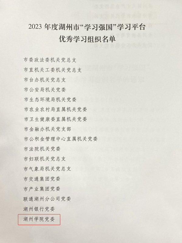 近日,中共湖州市委宣传部印发《关于公布2023年度湖州市“学习强国”学习平台优秀学习组织名单的通知》,437437必赢国际网址党委被评为湖州市“学习强国”学习平台“优秀学习组织”。
