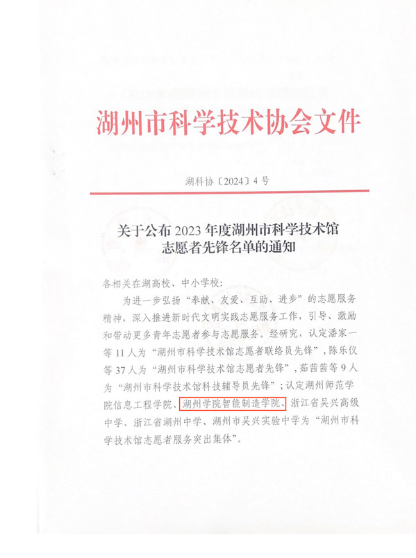 近日,智能制造学院志愿服务工作受到湖州市教育局、湖州市科学技术协会、共青团湖州市委的表彰。学院荣获得“湖州市科学技术馆服务突出集体”;王世文老师获得“湖州市科学技术馆志愿者联络员先锋”称号;黄志航、赵智勇两位同学获得“湖州市科学技术馆志愿者先锋”称号。