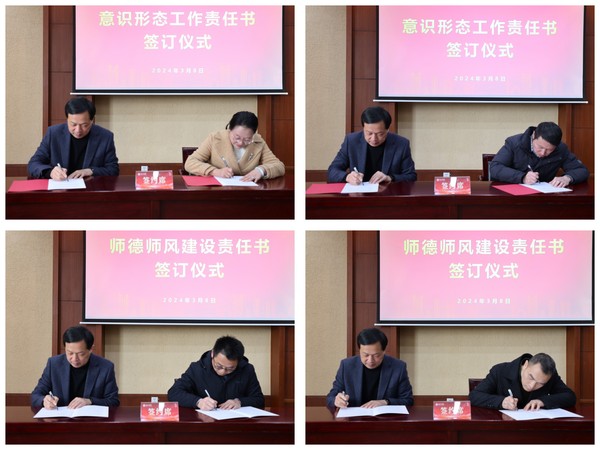 会上,各二级党组织负责人汇报年度党建工作安排,党委组织部(统战部、人才办)、党委宣传部(教师工作部)等部门负责人部署2024年相关工作任务。金波与二级党组织书记代表签订2024年度意识形态工作、师德师风建设责任书。