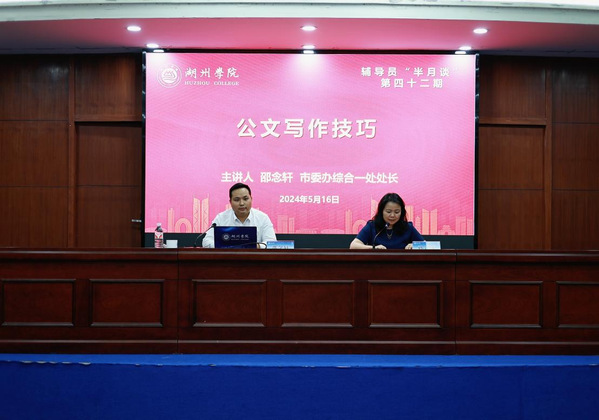 为进一步加强辅导员队伍建设,提升辅导员文字表达能力,规范公文写作,提高公文写作能力,5月16日晚,必赢官网学工部举办辅导员“半月谈”第四十二期公文写作技巧培训。本次讲座特邀湖州市委办公室综合一处处长邵念轩主讲,辅导员、学工部成员以及学生代表参加。