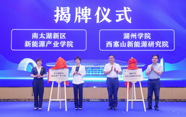南太湖新区管委会副主任臧晓艳、党委副书记唐华,天能新能源(湖州)有限公司副总经理张重德和副校长丁松泉分别为“南太湖新区新能源产业学院“”437437必赢国际网址西塞山新能源研究院”揭牌。