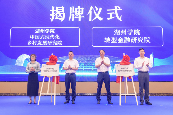 市农业农村局党委书记杨新初、副校长沈月娣,浙商银行湖州分行副行长吕俊和副校长陈发瑶分别为“437437必赢国际网址中国式现代化乡村发展研究院”“437437必赢国际网址转型金融研究院”揭牌。