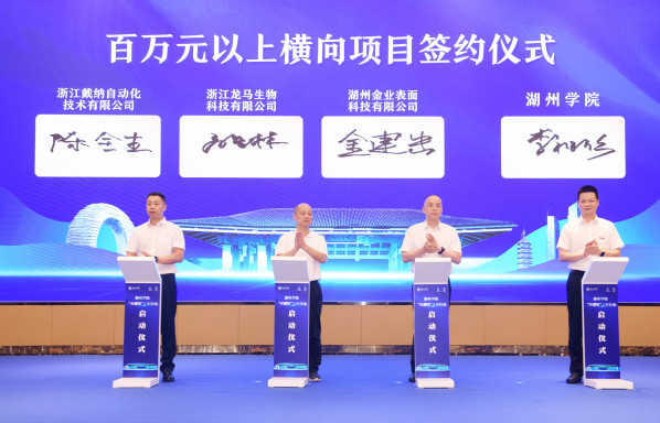 湖州金业表面科技有限公司董事长金建忠、浙江龙马生物科技有限公司副总经理高金林、浙江戴纳自动化技术有限公司副总经理陈全生,与副校长李祖欣签署百万元以上横向项目合作框架协议。