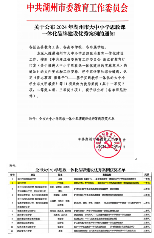 学校作为湖州市大中小学思想政治教育一体化建设共同体第二组牵头单位,积极参与一体化相关活动,推动一体化品牌建设,选派思政课教师参加一体化示范“金课”评选活动,近日,荣获湖州市大中小学思政课一体化品牌建设优秀案例一等奖1项,示范“金课”二等奖1项、三等奖2项。