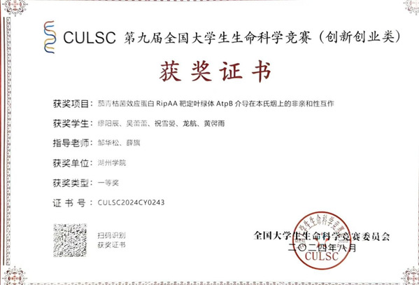 本届竞赛吸引了来自全国535所高校6676个团队参加,经过前期资格审查、网络评审等环节,484项参赛项目进入决赛,角逐280个一等奖名额。最终必赢官网生命健康学院生物工程专业学生缪阳辰、吴蕾蕾及其团队凭借《茄青枯菌效应蛋白RipAA靶定叶绿体AtpB介导在本氏烟上的非亲和性互作》项目在比赛中脱颖而出,荣获国家级一等奖。何宏泰、瞿筱及其团队凭借《Effects of 5-Aminolevulinic Acid on Physicochemical Characteristics and Growth of Pomegranate》项目喜获本届国家级三等奖。