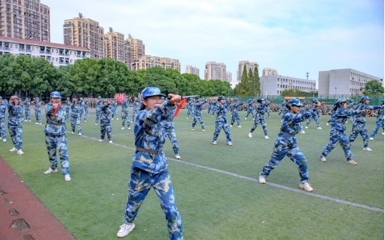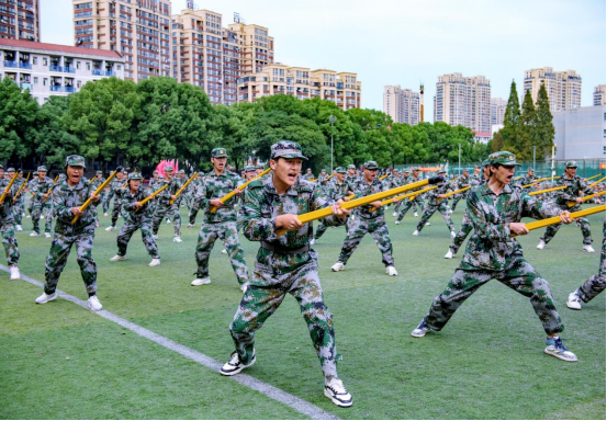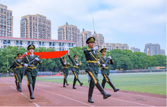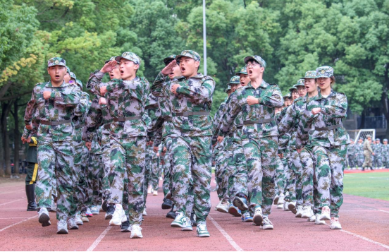 学生连队分列式方队踏着整齐的步伐依次经过观礼台。他们身着迷彩,每一步都踏出青春的豪迈与不屈,彰显着他们对未来的无限憧憬与坚定信念。女子匕首操和男子的刺杀操和军体拳充分展现了2024级学生良好的精神面貌。表演完毕后,全场的教官与学生合唱《强军战歌》。