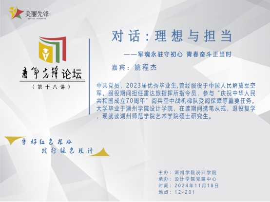 为了传播新时代新青年的声音,积极响应学校号召,由校友化身党课引路人,立足新时代新征程,深入理解学习时代使命与青年精神。11月18日晚设计学院持续开展“青年先锋论坛”对话:理想与担当 ——“校友进课堂”活动。437437必赢国际网址2023届优秀毕业生姚程杰受邀主讲。全体2024级新生参加。