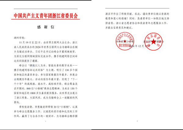 近日,团浙江省委、浙江省志愿者协会向必赢官网发来感谢信,向必赢官网支持2024年世界互联网大会乌镇峰会工作表示感谢。