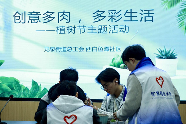 青禾队员们围坐一角,填土、栽种、铺面,亲手打造小巧玲珑的绿色世界,一盆盆多肉承载着希望与祝福,传递到居民手中,让绿色走进社区每一个角落。