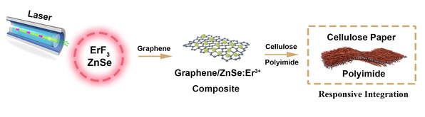 该研究设计并构筑了一种柔性Graphene nanoplatelets/ZnSe:Er3+复合材料,实现了光-电-热多性能的有效转换,并应用于柔性仿生花的可视化驱动。这种复合材料的设计为软执行器中的多信号交叉反馈提供了解决方案,同时加强了对运动感知的监控和引导。