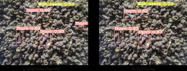研究概述:目前,青花椒的质量评估主要依赖人工识别杂质。然而,人工识别方法不仅费时费力,还容易受到主观因素影响,难以满足高效、精准的工业检测需求。因此,本研究以检测精度和推理速度为核心评价指标,探索了适用于青花椒杂质检测的卷积神经网络(CNN)模型。研究表明,在检测精度方面,YOLOv5m优于主流目标检测算法(包括 Faster R-CNN、Grid R-CNN 和 RetinaNet)。为进一步提升检测性能,研究引入了基于相似性的注意力机制模块(SimAM),并将其融入YOLOv5m网络,实现了YOLOv5m-SimAM融合算法。实验结果显示,与原始YOLOv5m相比,YOLOv5m-SimAM在所有类别的平均精度(AP)和F1分数上均有所提升。此外,在模型参数量和计算复杂度(FLOPs)基本相同的情况下,YOLOv5m-SimAM的计算成本降低了50%,推理速度进一步优化,在缩短推理时间的同时保持了高检测精度。该研究为青花椒等农产品的智能化分选提供了高效、精准的检测方案,具有一定的工程应用价值。